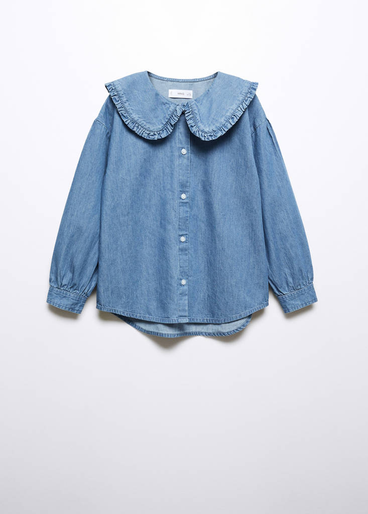 Straight design. Denim style. Long sleeves. Babydoll collar. Front closure. Button up. Buttoned cuffs. This garment is also available in Baby Girl´s collection