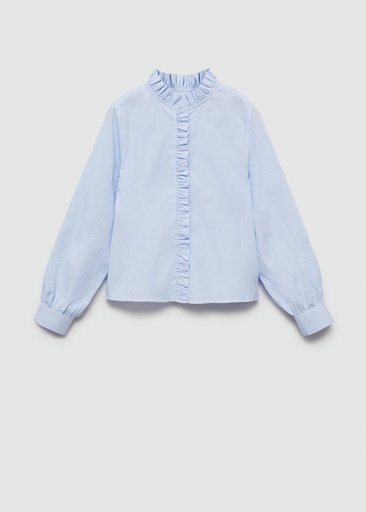 Back to school collection. Straight design. Frill detail on the back section. Ruffles detail on the neck. Long sleeves with buttoned cuffs. Round neck. Front closure