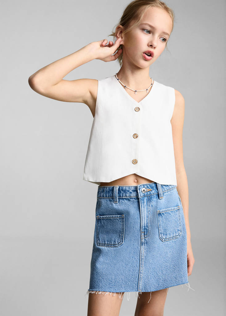 Crafted from 100% cotton fabric with a denim cowboy style, this garment features a straight and short design. It includes a Regular Waist rise, belt loops, a button and zip fastening, two front patch pockets, and a frayed hem