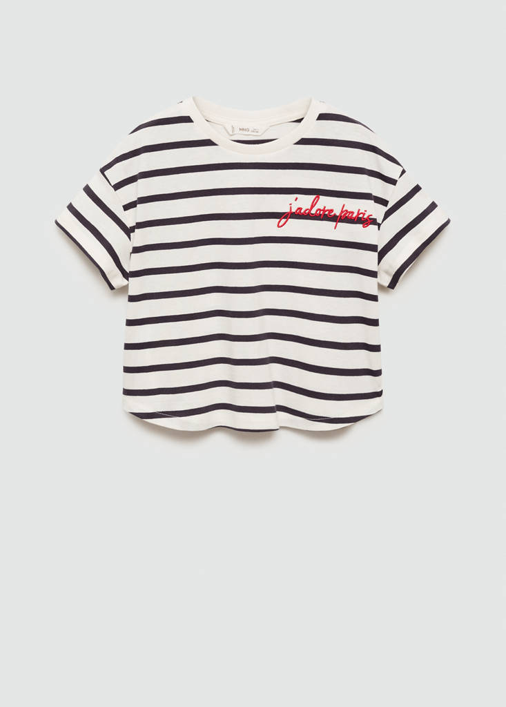 Back to school collection. Embroidered message. Straight design. Round neck. Short sleeves. Striped design