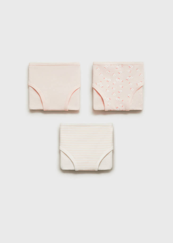 Pack of 3. Cotton fabric. Basic design. Floral print. Striped print. Classic panty. Elasticated waistband. Classic design. Flowers print
