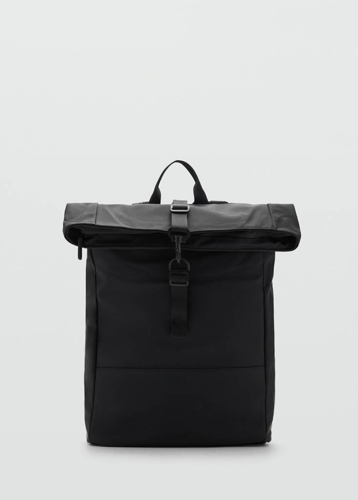Gummed fabric. Two handles. Internal pocket for electronic devices up to 25 cm wide. Band handle for easy transport as a carry-on bag. Zipped main compartment. Flap closure with carabiner clasp and adjustable strap