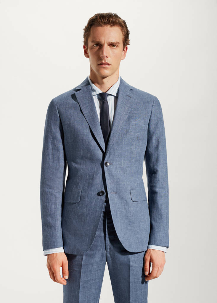 100% linen fabric. Slim fit. Light fabric. Standard design. Notched lapel. Front button closure. Welt pocket on the chest. Two pockets with flaps on the front. Long sleeve with buttoned cuffs. Straight hem. Inner lining. Three inside pockets. Tailoring collection. Basics Collection