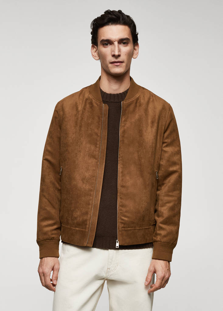 The medium brown colour is an online exclusive. Bomber design. Faux suede. Front zip closure. Long sleeves with elastic cuffs. Two side pockets with zip closure. Hem with elastic band. Inner zipped pocket. Inner lining
