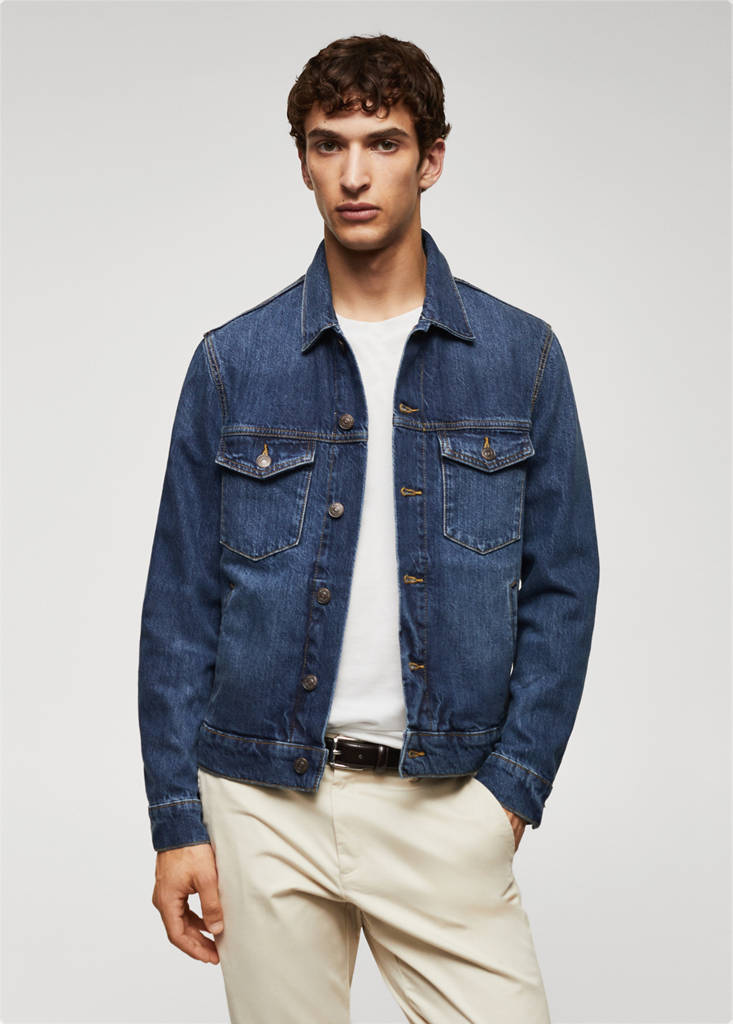 Basics Collection. Denim-style cotton fabric. Short design. Long sleeves with buttoned cuffs. Twin buttoned flap pockets at front. Two side pockets. Adjustable waistband with straps and buttons on both sides of the hips. 100% cotton fabric. Front closure with buttons. Classic collar