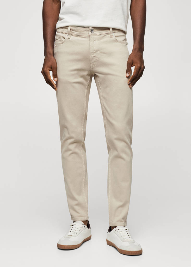 Sustainable cotton blend fabric. Cropped design. Five pockets. Medium waist. Heavy structure. Skinny fit. Loops. Two side pockets. Coin pocket. Two patch pockets on the back. Zip and one button fastening. The model is wearing a size 42. Basics Collection. Denim jeans style