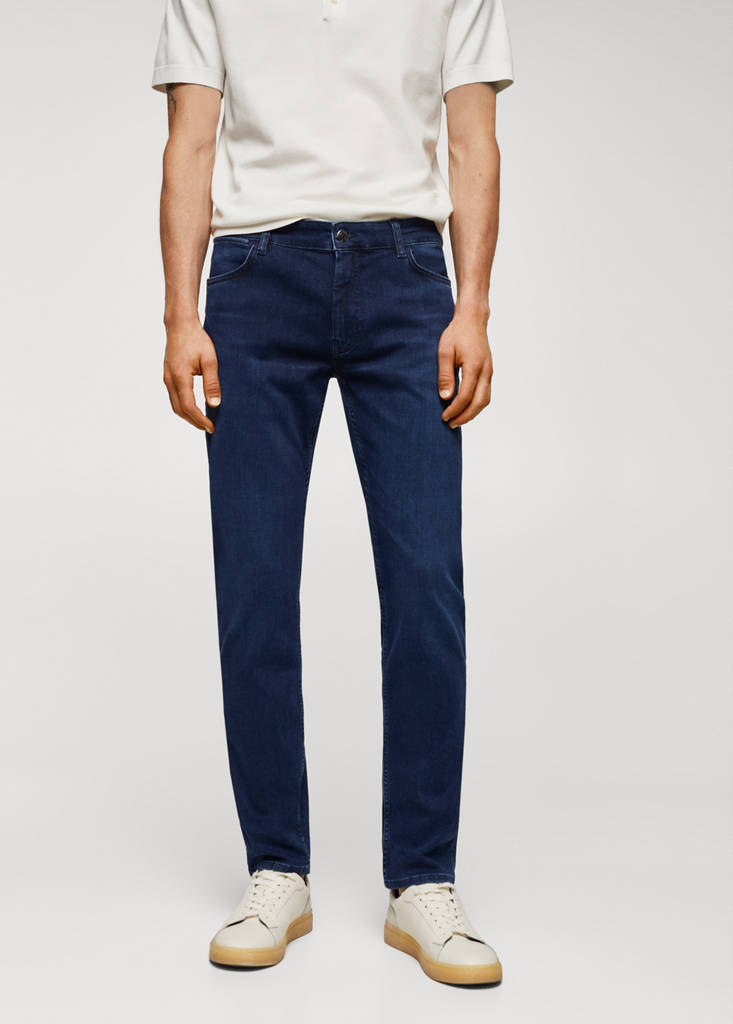 ESSENTIALS: Made to last. Slim fit. Cotton-blend fabric. Grey. Loops. Two side pockets. Coin pocket. Two patch pockets on the back. Zip and one button fastening. The model is 183cm and is wearing a size 42. Denim jeans style