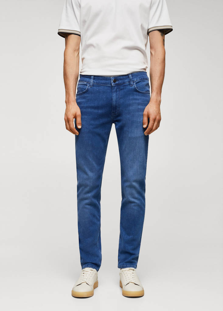 ESSENTIALS: Made to last. Slim fit. Denim style cotton fabric. Black. Loops. Five pockets. Zip and one button fastening. The model is 185 cm tall and is wearing a size 42. Denim jeans style