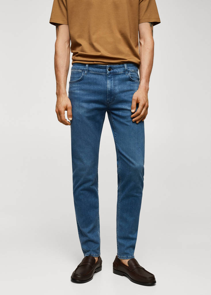 ESSENTIALS: Made to last. Slim fit. Recycled cotton-blend fabric. Loops. Two side pockets. Coin pocket. Two patch pockets on the back. Zip and one button fastening. The model is 185 cm tall and is wearing a size 42. Denim jeans style