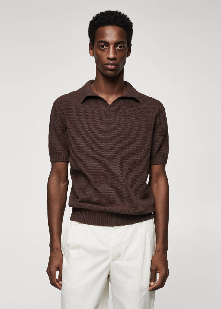 Recycled cotton-blend fabric. Thick knitted fabric. Geometric structure finish. Straight-fit. Polo shirt with buttonless collar. Short sleeve. Straight hem. Elastic ribbed endings. The model is 190 cm tall and is wearing a size M. Antoine Griezmann Campaign