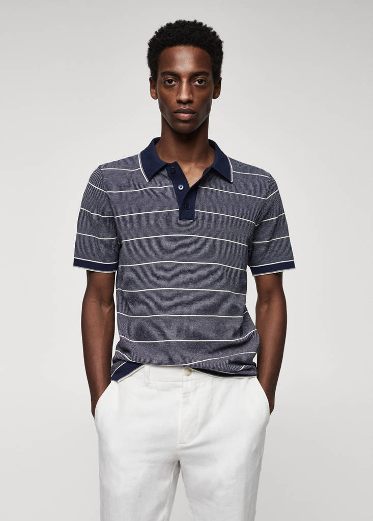 Cotton-blend fabric. Fine knit fabric. Striped structure. Straight-fit. Polo neck. Short sleeve. Contrast elastic ends. The model is 190 cm tall and is wearing a size M