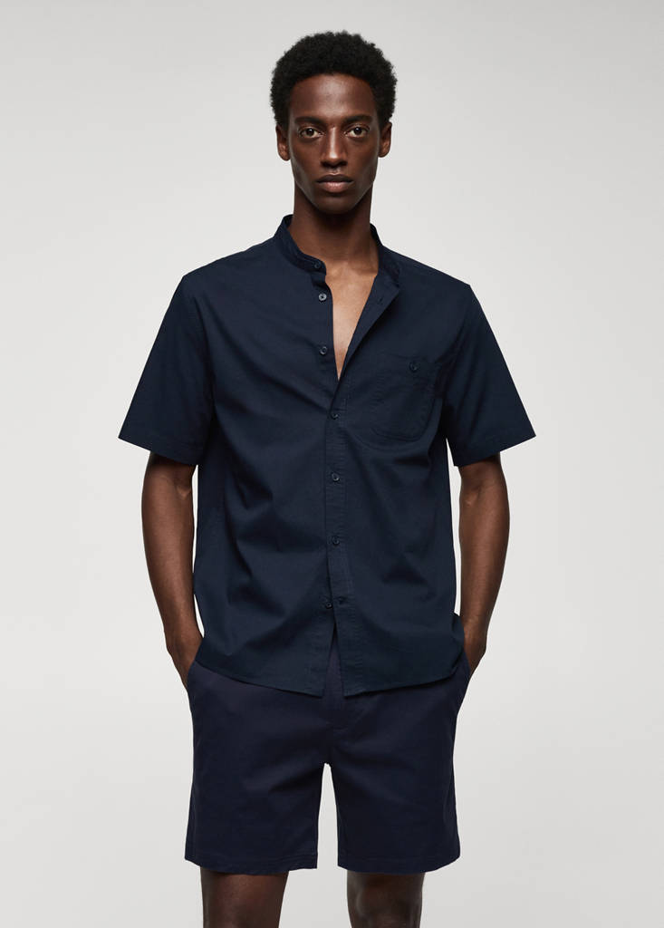 100% cotton mandarin collar shirtCurrent price [đ 1,299,000 ]đ 1,299,000Select a colourNavyThe model is wearing size M and is 189cm tall.Select your sizeXSSMLXLDimensionsAdd to WishlistSee lookFree delivery to store100% Cotton. Regular fit. Mao neckline. Buttoned patch pocket on the chest. Short sleeves. Front closure with buttons. Rounded baseDetails, composition and careStore availability