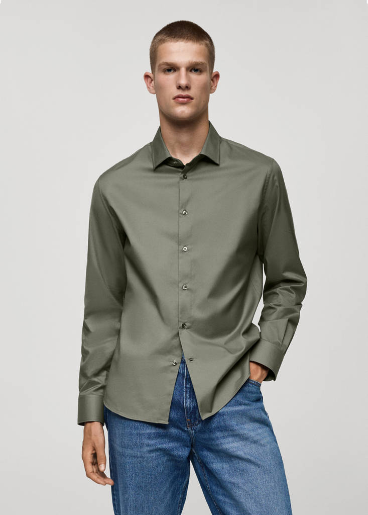 Regular fit. Twill fabric. Long sleeves with buttoned cuffs. Classic collar. Rounded base. 100% cotton fabric. Front closure with buttons
