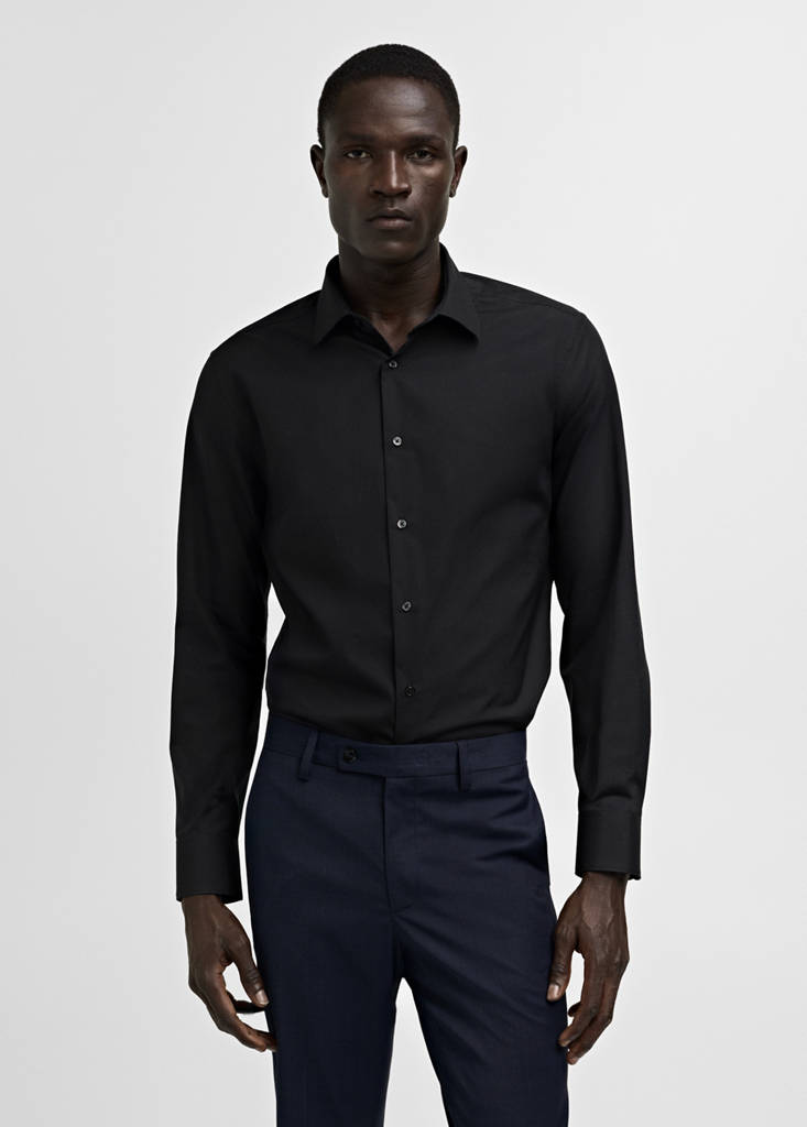Slim fit. Poplin fabric made of 100% cotton. Easy iron. Soft-roll collar. Long sleeves with buttoned cuffs. Front button closure. Rounded base. Stretch cotton fabric. Cutaway collar. Button fastening at the front