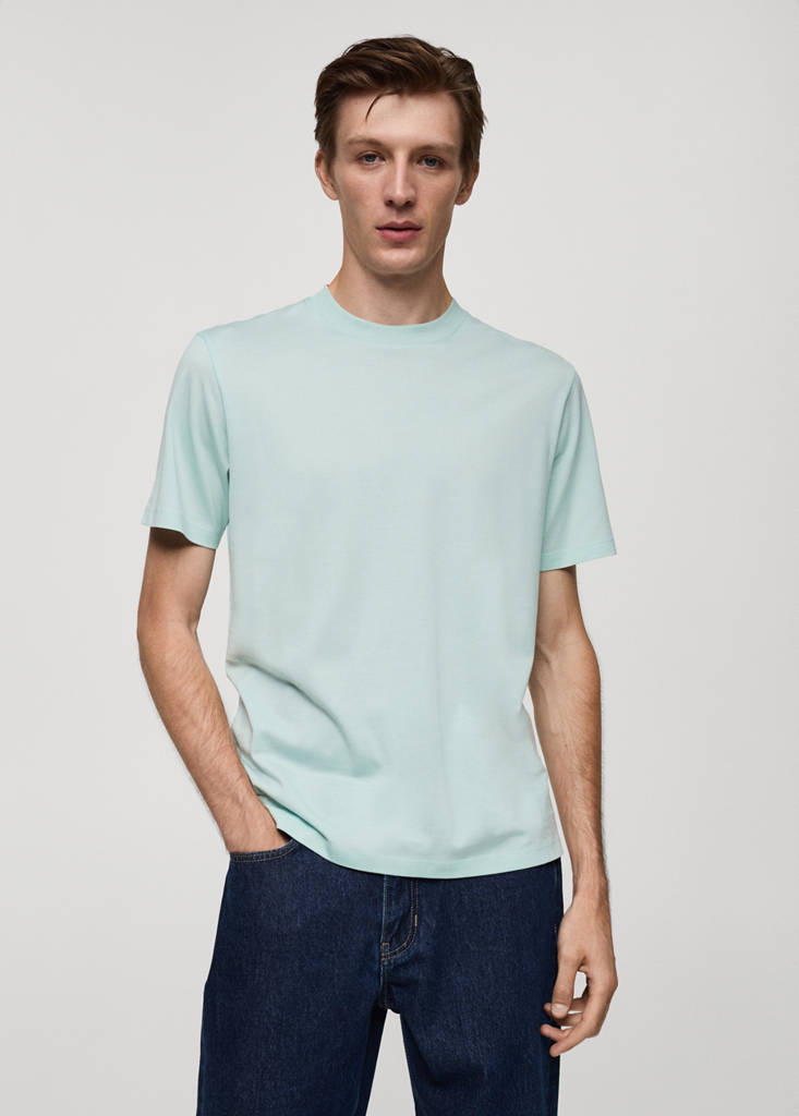 ESSENTIALS: Made to last. Slim fit. Mercerised finish. Round neck. Short sleeves. Straight hem. 100% cotton fabric. Sustainable cotton fabric. Regular fit. The chocolate brown and sand models are an online exclusive. Standard Length. Slim Silhouette. Light cotton. 100% mercerised cotton. Round Lapel Collar. Short Sleeve Length. The ivory color is exclusive online. Short sleeves. The model is wearing a size M
