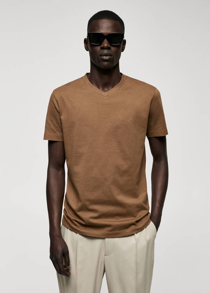 Basics Collection. Sustainable cotton fabric. Regular fit. Light cotton. V-neck. Short sleeves. The model is wearing a size M. 100% cotton fabric. Standard Length. Flat structure Lightweight. Slim Silhouette. Peak Lapel. Short Sleeve Length. No Print. No Fantasy. Slim fit. Standard design. Lightweight fabric