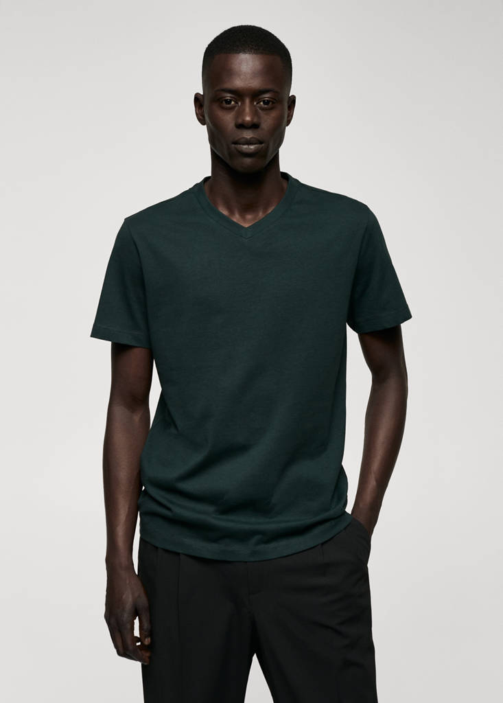 Basics Collection. Sustainable cotton fabric. Regular fit. Light cotton. V-neck. Short sleeves. The model is wearing a size M. 100% cotton fabric. Standard Length. Flat structure Lightweight. Slim Silhouette. Peak Lapel. Short Sleeve Length. No Print. No Fantasy. Slim fit. Standard design. Lightweight fabric