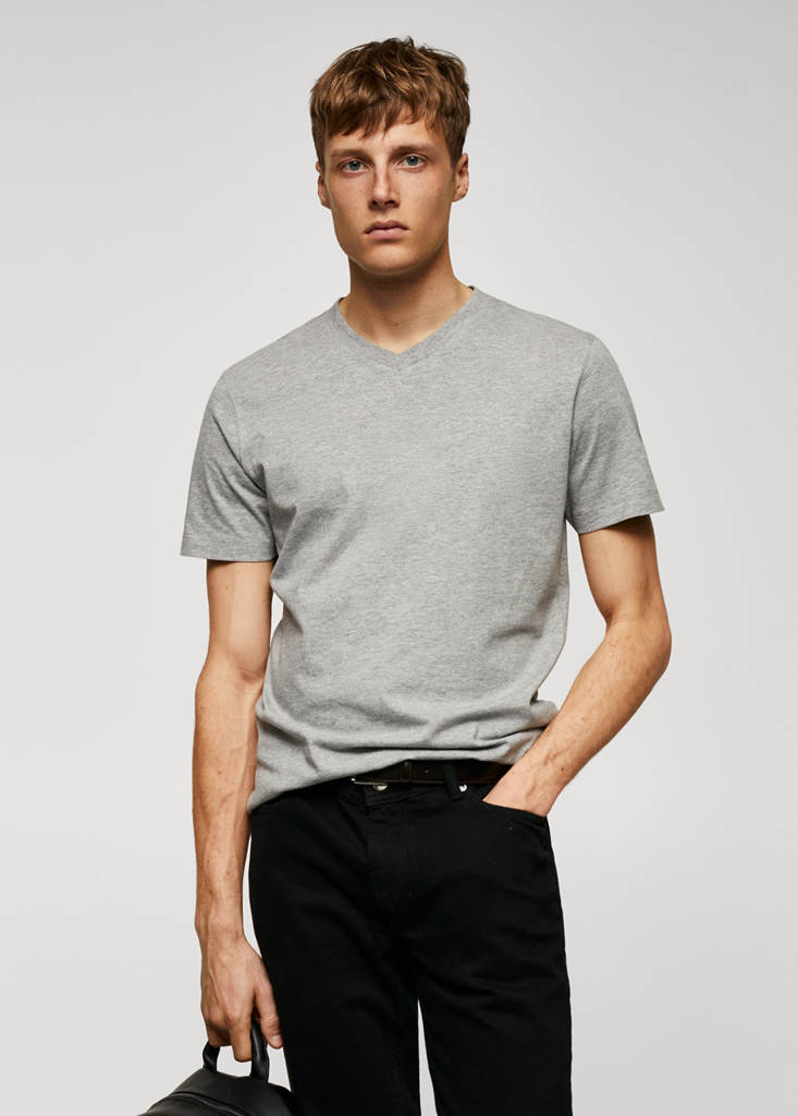 Basics Collection. Sustainable cotton fabric. Regular fit. Light cotton. V-neck. Short sleeves. The model is wearing a size M. 100% cotton fabric. Standard Length. Flat structure Lightweight. Slim Silhouette. Peak Lapel. Short Sleeve Length. No Print. No Fantasy. Slim fit. Standard design. Lightweight fabric