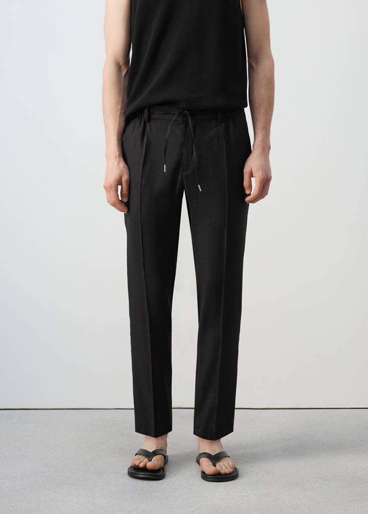Slim fit. Crop Length. Linen mix. Stripe design. Elastic waist with adjustable drawstring. Lanyard with option of visible or hidden knot on the inside. Belt loops. Two side pockets. Front zipper and button closure