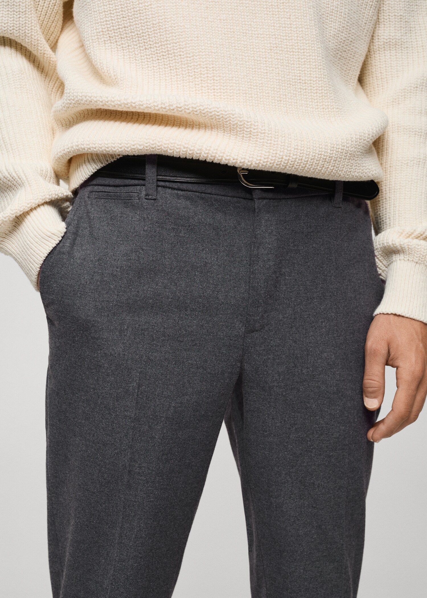 Cotton fabric. Slim fit. Ironed stripe detail at front and back. Belt loops. Elastic band on the inside of the waistband for added comfort. Double-breasted and zipped front closure. Two side pockets. Straight hem. The model is 185 cm tall and is wearing a size 42.