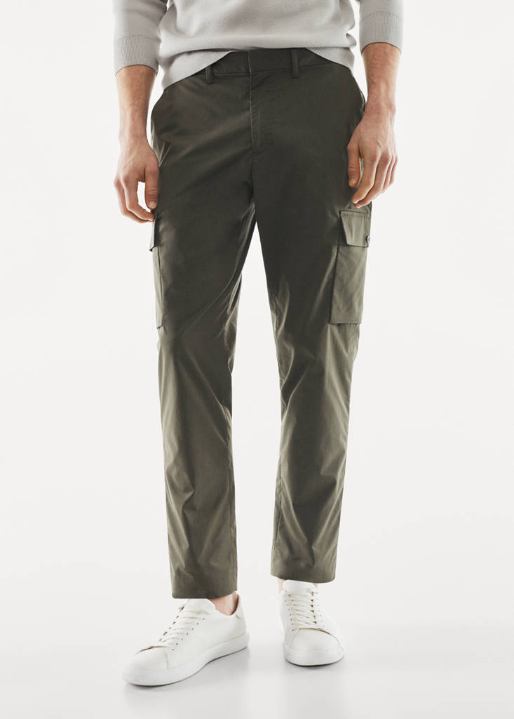 Slim fit. Technical fabric. Zip and press stud fastening. Belt loops. Two side pockets on the trousers. Two patch pockets on the front with buttons. Two pockets with flaps on the back. Non-crease. The fibres of this fabric come from recycled sources. This way, we contribute to promoting a circular economy which is more sustainable