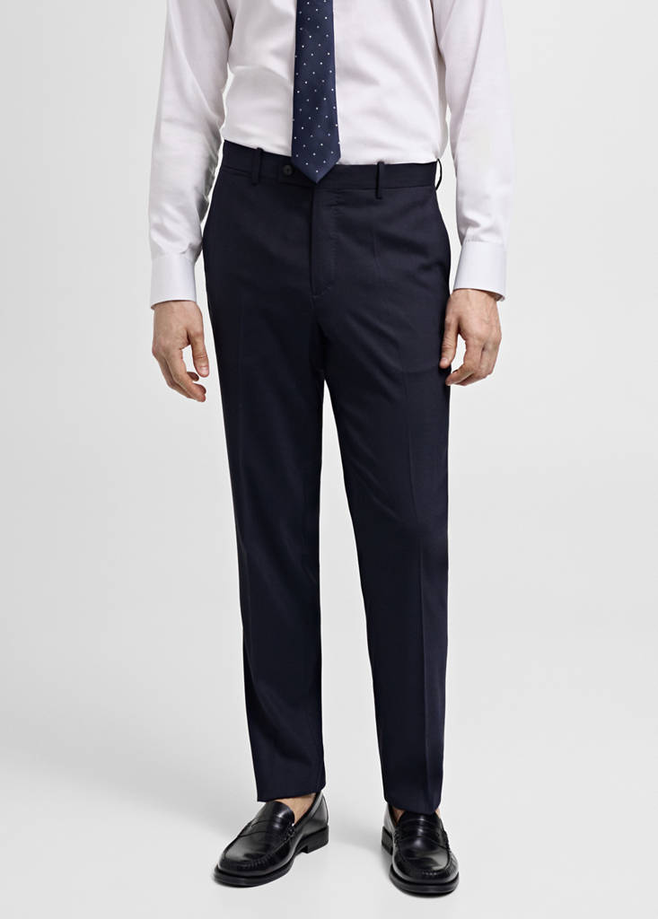 Bi-Strech: bi-directional stretch fabric for added comfort. Non-crease. Slim fit. Wool mix fabric. Herringbone structure. Lightweight fabric. Mid-rise. Belt loops. Button, hook and zip closure. Two side pockets. Concealed coin pocket at hip level. Two welt pockets with button at the back. Tailoring collection. Thermoregulating: This fabric offers optimal breathability to keep you at a stable temperature. Pressed crease detail at the front and back