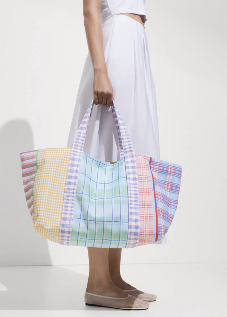 Large. Canvas fabric. Checked print. Double handle. Shoulder strap. Interior pocket. Zip fastening. Inside magnet fastening. Inner lining. Beach accessories. 100% cotton fabric