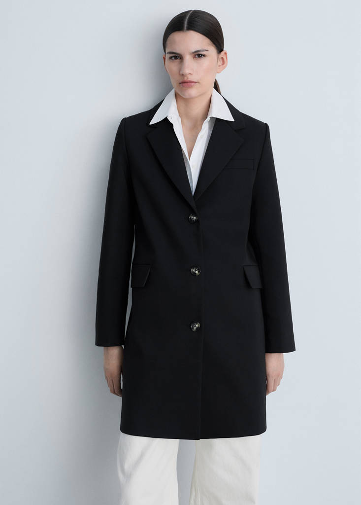 Cotton blend fabric. Midi design. Straight design. Lapel-collar V-neck collar. Lapel with notch. Long sleeves. One welt pocket on the chest. Two side pockets with flaps. Button fastening at the front. Back vent at the hem. Inner lining