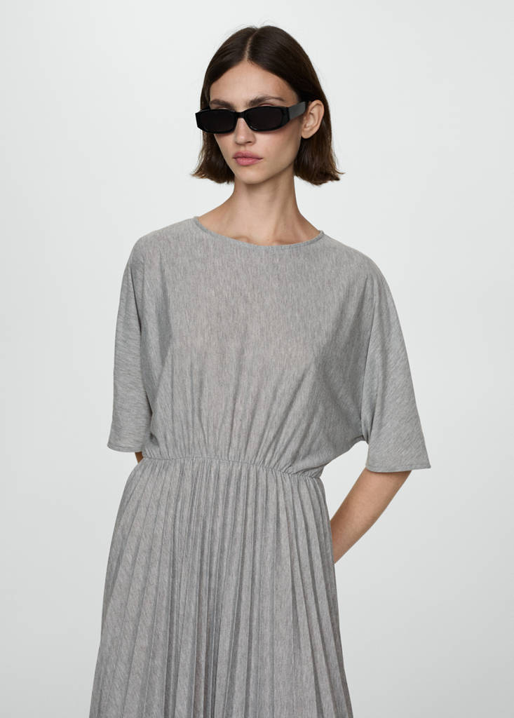 Fluid fabric. A-line design. Long design. Pleated design. Round neck. Short sleeves. Elasticated waistband