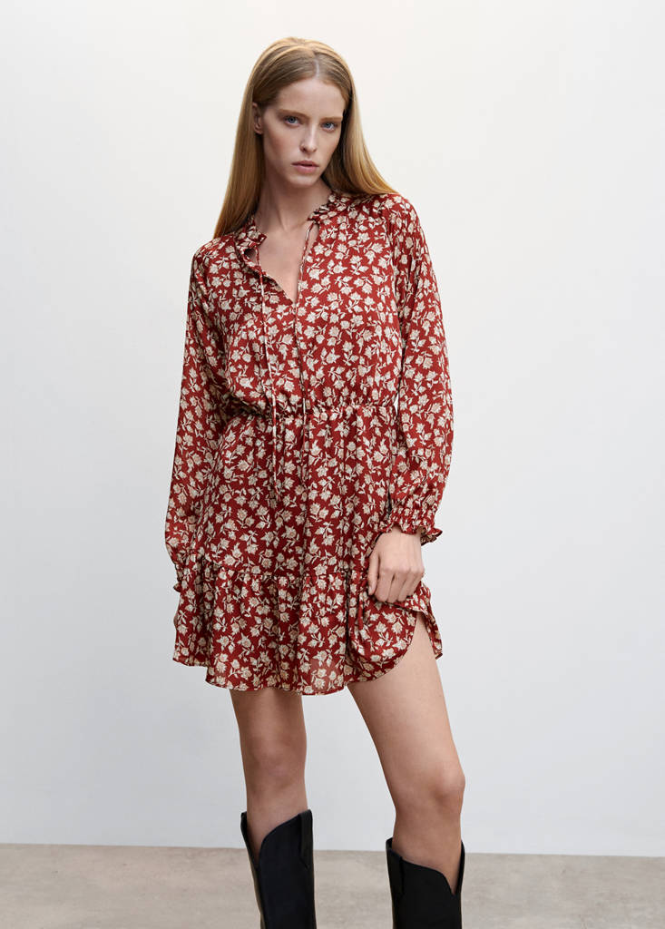 Flowy fabric. Evasé design. Short design. Rounded neck. Ruffle details. Floral print. Long sleeve with elastic cuffs. Bow fastening on the neck