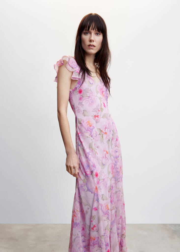 Flowy fabric. Straight design. Asymmetric design. Floral print. V-neck. V-neckline in the back. Sleeve with maxi frill detail. Side zip fastening. Dart detail. Party and events collection