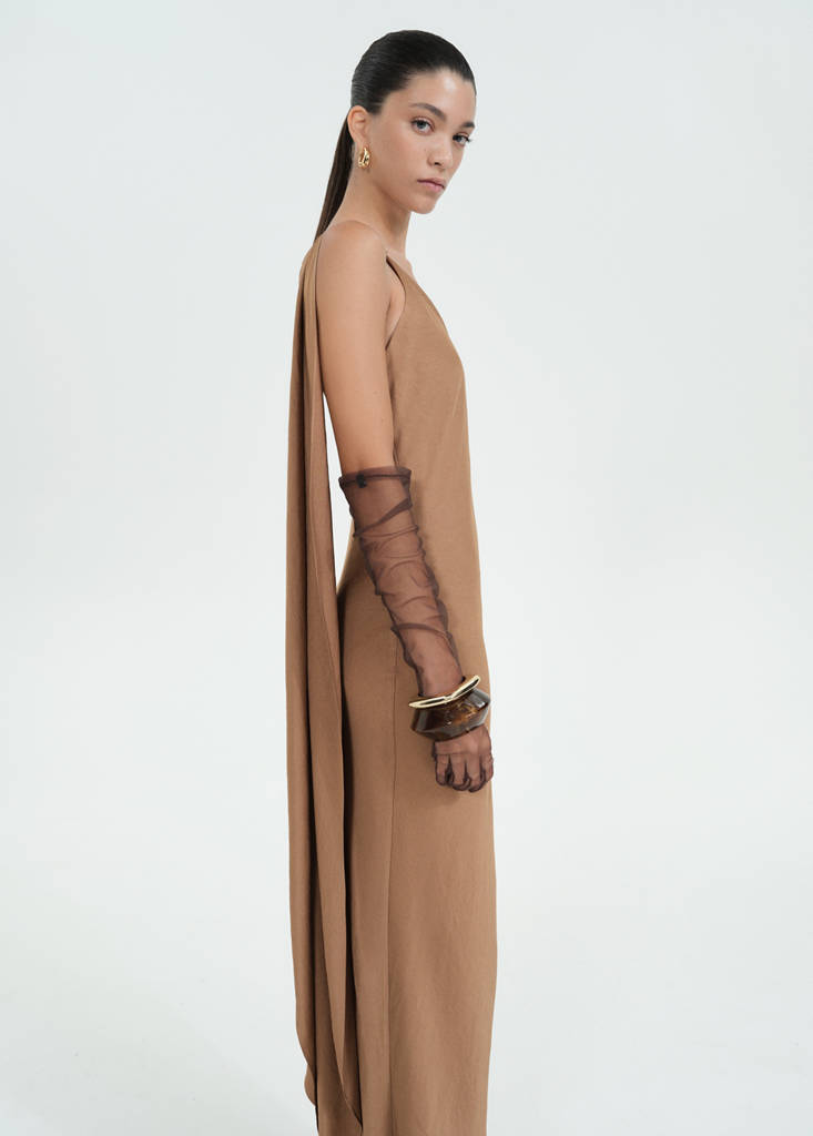 Fluid fabric. Long design. Fitted design. Layer design. Asymmetric neckline. Wide strap. Decorative knot. Double strap. Asymmetric hem. Party, ceremony and communion collection. Selection Collection