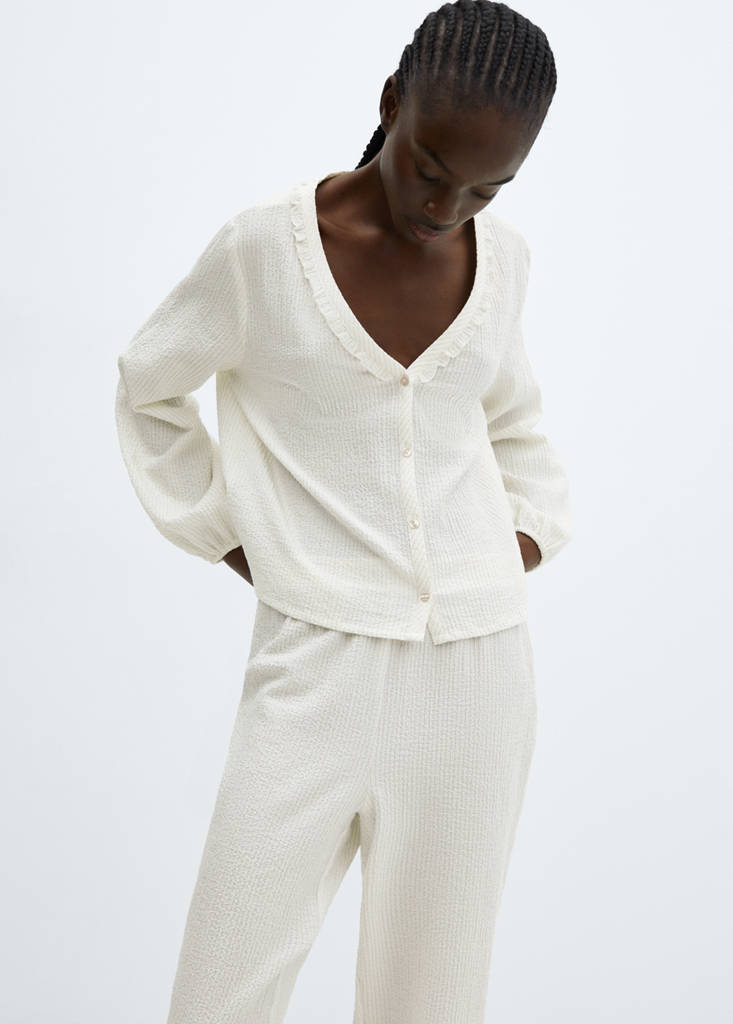 Set of two. Cotton fabric. Oversized design. Short design. Shirt collar. Ruffles detail on the neck. Long puffed sleeves. Elastic cuffs. Button fastening at the front