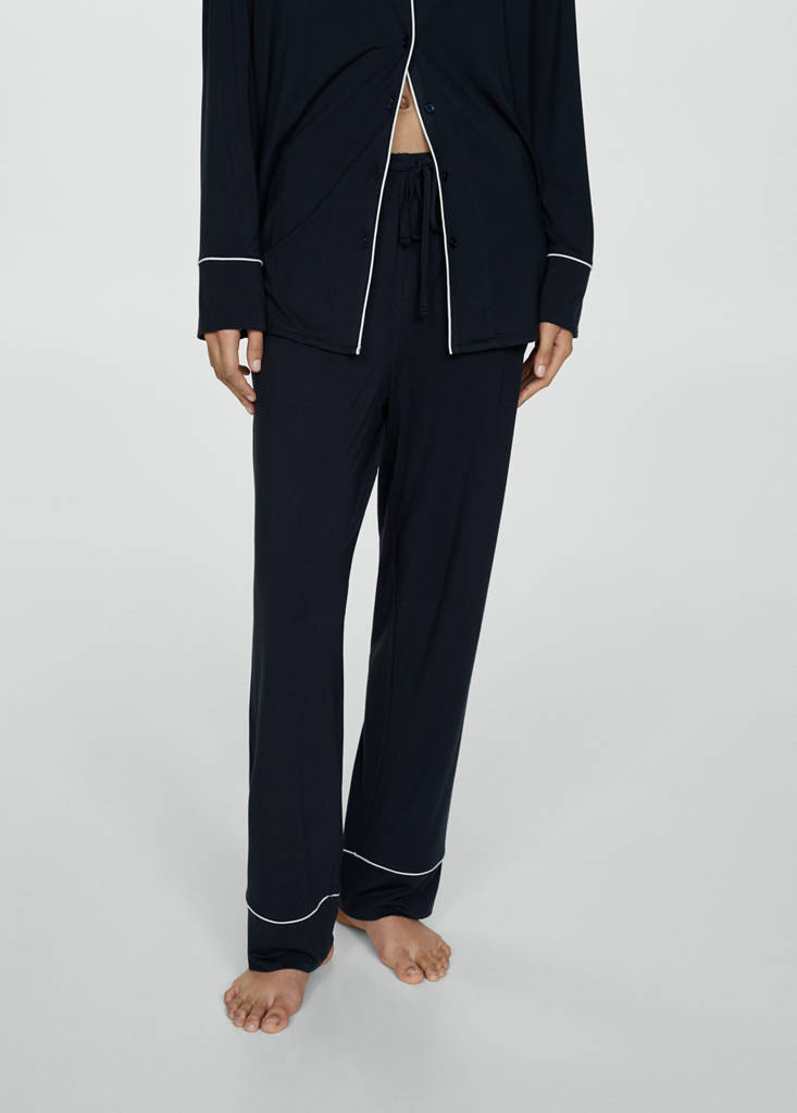 Two-piece pyjamas with pipingCurrent price [đ 1,999,000 ]đ 1,999,000Select a colourDark NavySelect your sizeXSSMLXLDimensionsAdd to WishlistSee lookFree delivery to storeFluid fabric. Long design. Straight design. Notched lapel collar. Lapel with notch. Long sleeves. Elastic waist with tie closure. Contrast trims. Two pieces. Front closure with buttonsDetails, composition and careStore availability