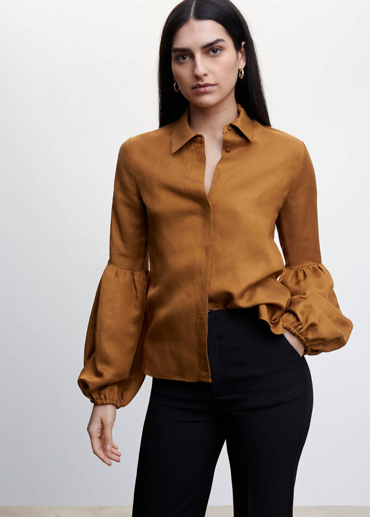 Linen mix. Straight design. Shirt-style collar. Long sleeve. Front button closure. Long puffed sleeves