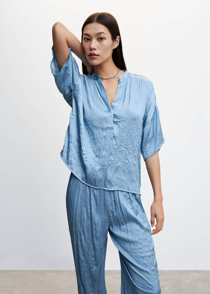 Satin. Pleated fabric. Oversize design. Stand-up collar. V-neck. Puffed short sleeve. Unclosed. Co-ord
