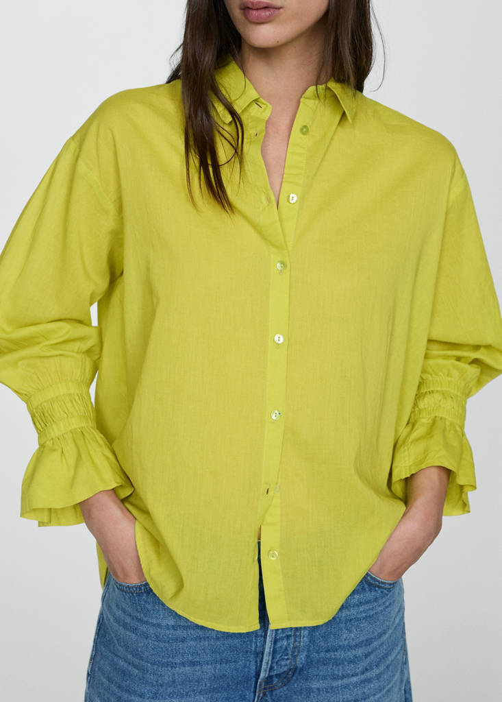 Ruched sleeve shirtCurrent price [đ 1,099,000 ]đ 1,099,000Select a colourLimeThe model is wearing size S and is 179cm tall.Select your sizeXXSXSSMLXLXXLDimensionsAdd to WishlistSee lookFree delivery to storeLong design. Straight design. Shirt collar. Long sleeves. Available in plain and patterned. Ruched detail on the cuffs. Front closure with buttons. 100% cotton fabricDetails, composition and careStore availability