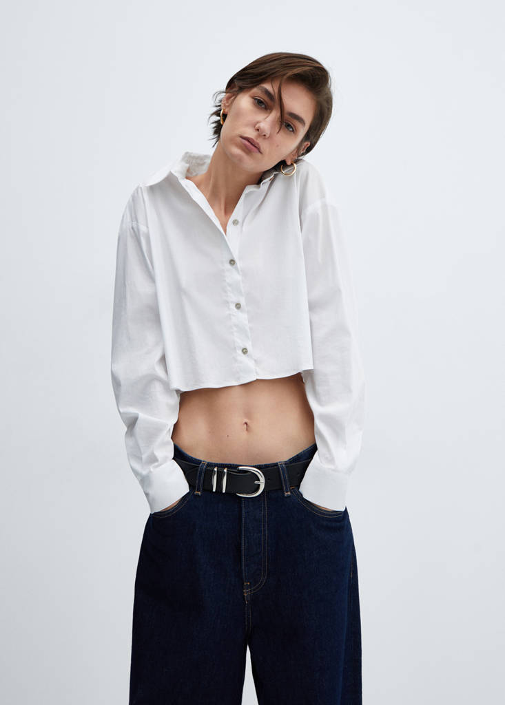 Cotton blend fabric. Straight design. Crop design. Shirt collar. Button fastening at the front. College. Office looks. Long buttoned sleeves