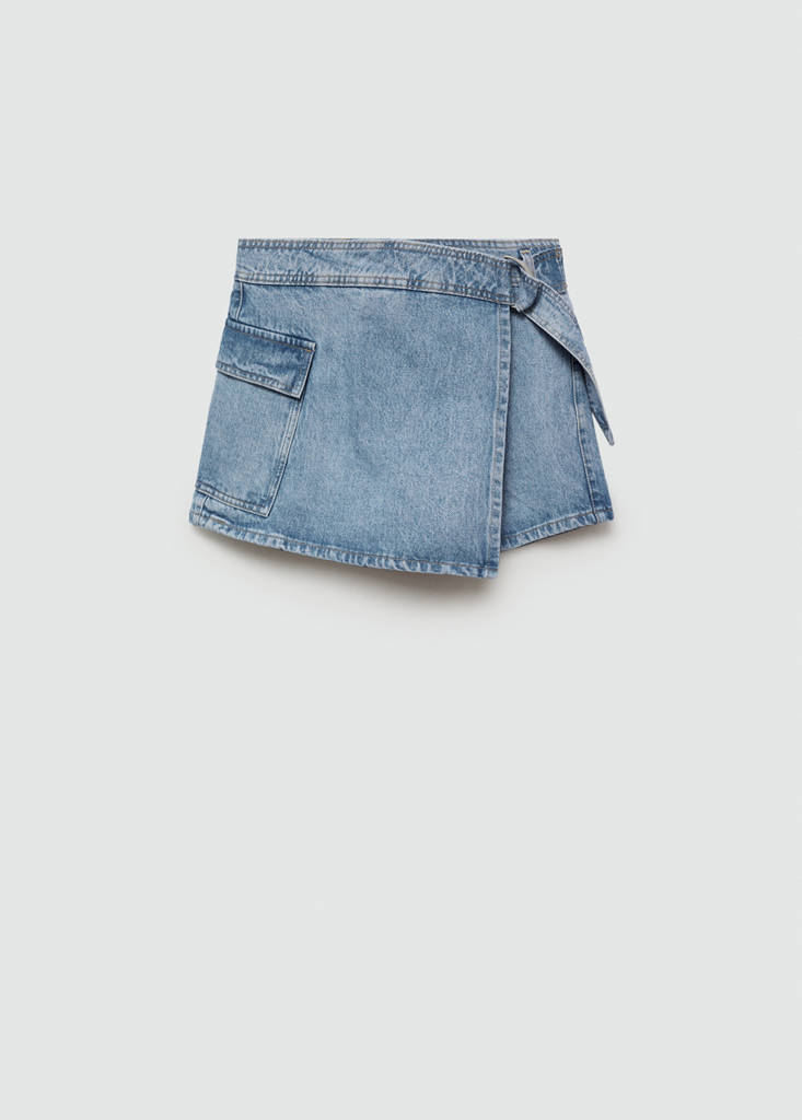 Denim-style cotton fabric. Mid-rise. Skort design. Straight design. Short design. Belt loops. Patch pocket on the side. Double button and zip closure. Decorative belt
