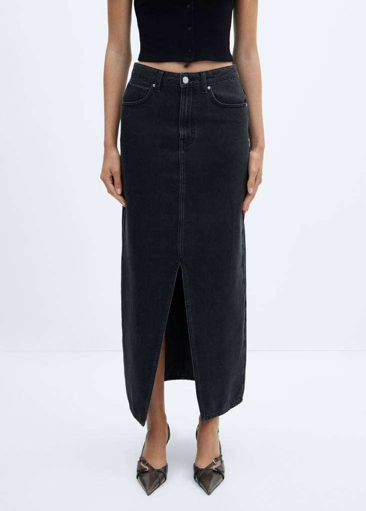 Denim-style cotton fabric. Straight design. Long design. Mid-rise. Five pockets. Belt loops. Zip and button fastening. Back vent at the hem. Available Plus. College