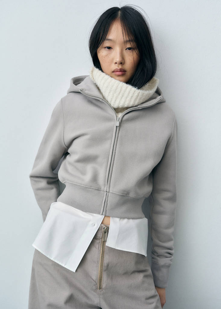 Cotton fabric. Crop design. Regular fit. High neck. With hood. Long sleeves with elastic cuffs. Zip fastening on the front section