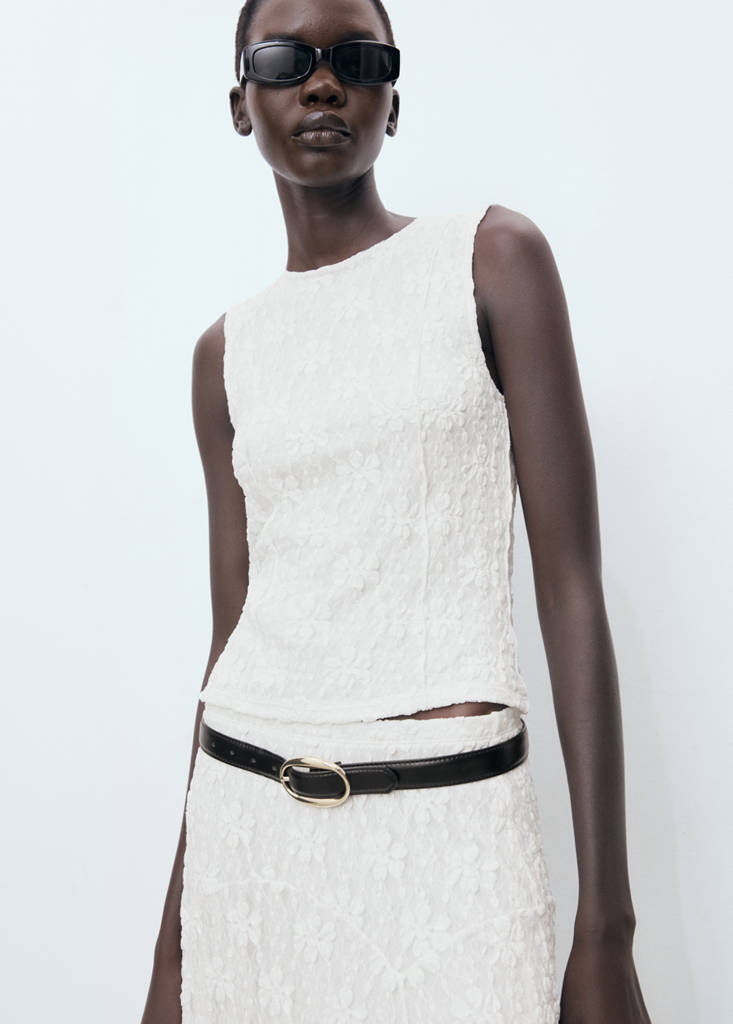This sleeveless design is crafted in lace, featuring intricate floral details that add texture to the design. The silhouette is fitted, accentuating the figure, and it has a closed round neckline. Pair it with its matching skirt to create a total look