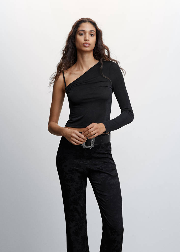 Fitted design. Asymmetric design. Thin strap. Gathered detail. Long sleeve. Party and events collection