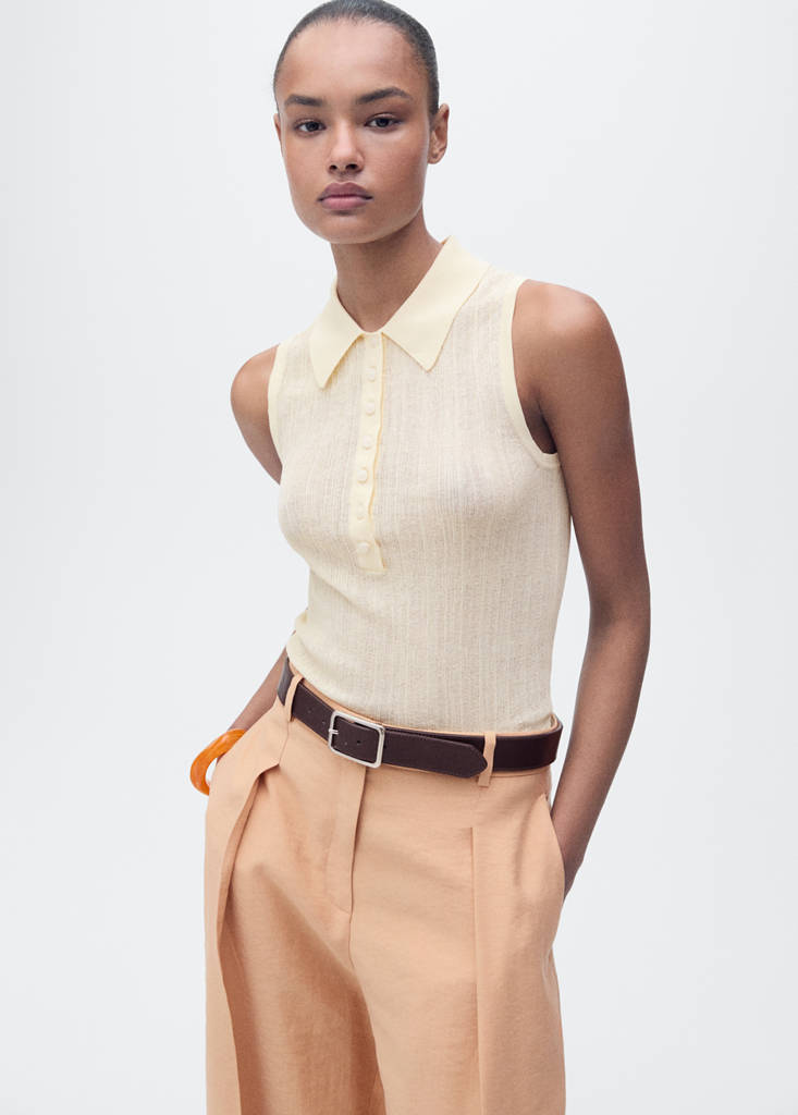 Cotton fabric. Fine knit fabric. Fitted design. Polo collar. Sleeveless. Front closure with buttons