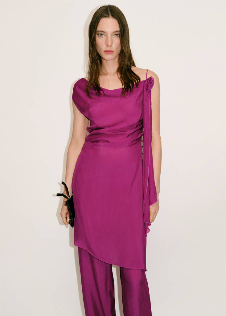 Straight design. Long design. Draped neckline. Short sleeves. Thin strap. Flower detail. Side button fastening. Total look. This garment belongs to our event collection, designed to make you the perfect guest at any party, wedding or ceremony
