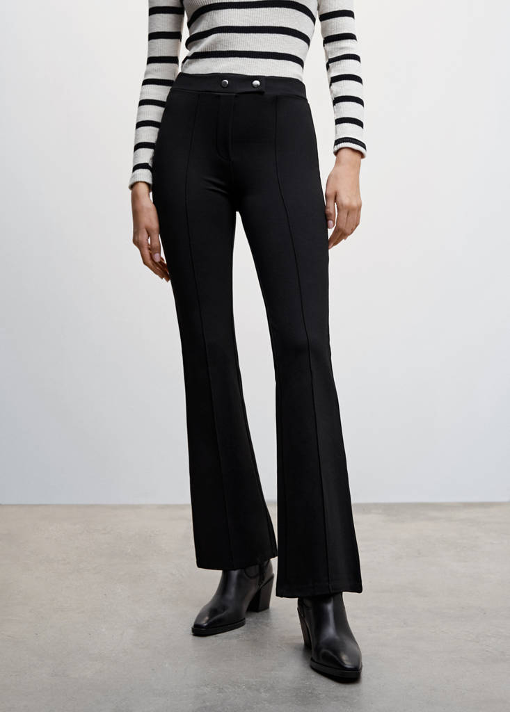 Knitted fabric. Elastic. Fitted design. Flare design. Press stud fastening on the front. Decorative seams