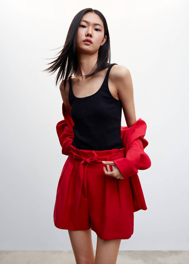 Flowy fabric. Paperbag. Short design. Straight design. Loops. Adjustable belt. Two side pockets. Concealed button, hook and zip fastening. Dart detail. Co-ord