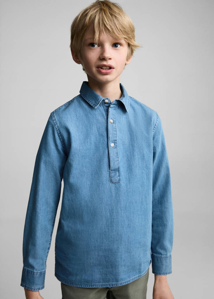 Denim-style cotton fabric. Polo-neck with button closure. Long sleeves. Buttoned cuffs