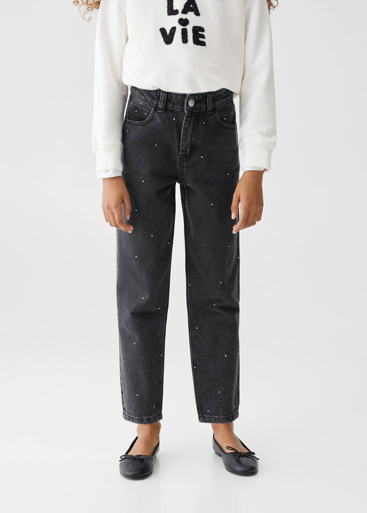 Denim-style cotton fabric. Mom-fit. Long design. Sparkly decorative appliqués. Belt loops. Zip and button fastening. Five pockets