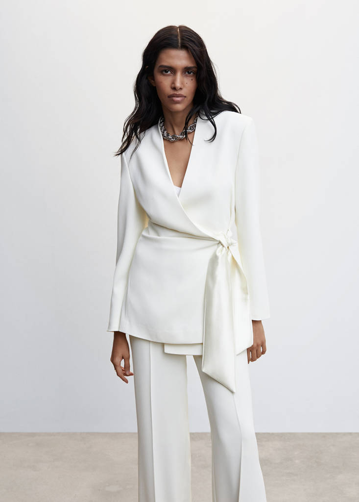 Flowy fabric. Straight design. Crossed V-neck. Peak lapel. Long sleeve. Shoulder pad. Knot closure. Inner lining. Party and events collection
